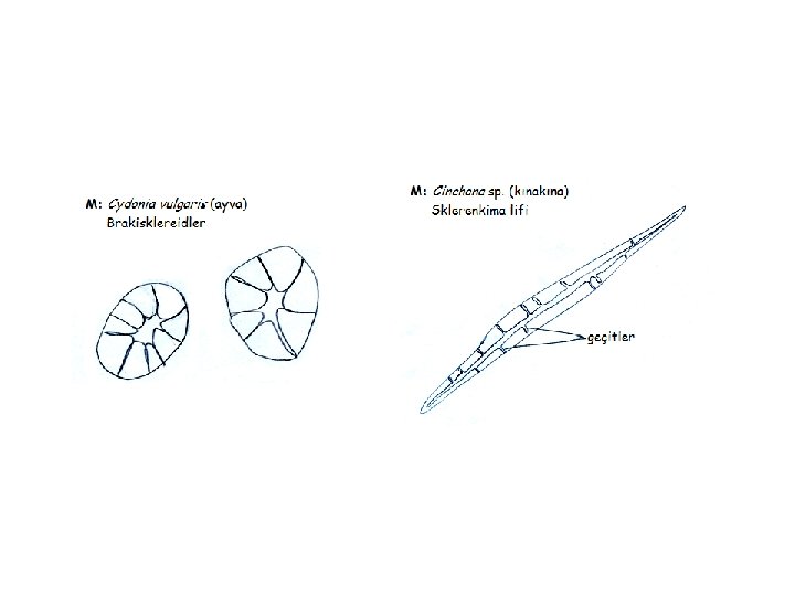 1. Sklereidler: • Genellikle kısa olan hücrelerdir. • Hücreler liglinleşmiş kalın sekonder çeperlidir ve çok sayıda basit geçit içerir. • Bitki yapısında çok fazla yayılmışlardır. • Bazen tek, bazen gruplar halinde bulunurlar. • Fındık gibi meyvaların kabuklarında, ayva ve armut gibi meyvaların etli kısmında bulunurlar. • Şekil, büyüklük ve çeper özelliği bakımından beş gruba ayrılırlar: 1. Brakisklereid 2. Makrosklereid 3. Osteosklereid 4. Astrosklereid 5. Trikosklereid