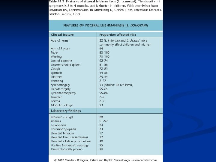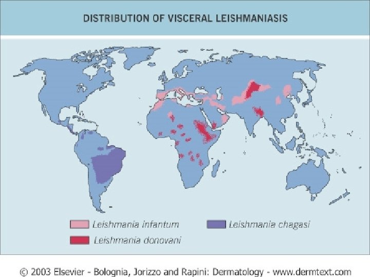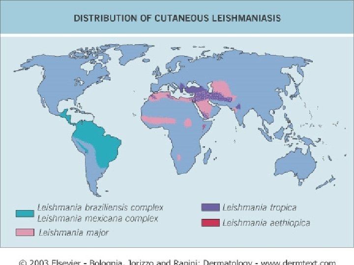 LEISHMANIASIS n n n a protozoal disease caused by Leishmania tropica parasite, which is transmitted by the Phlebotomus sand fly. The reservoir hosts are the dog in the Mediterranean area, man in the Middle East and the wild rodents in Asia and Africa. Leishmaniasis has three different morphological features ; n n n cutaneous leishmaniasis , muco-cutaneous visceral (Kala-azar ).