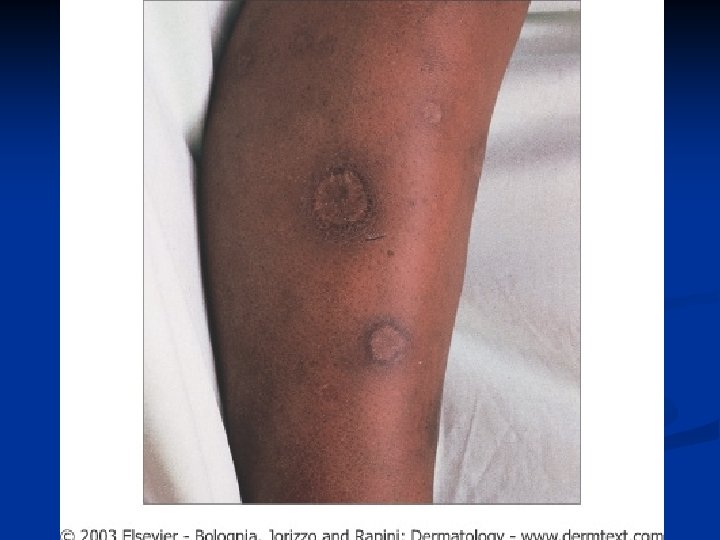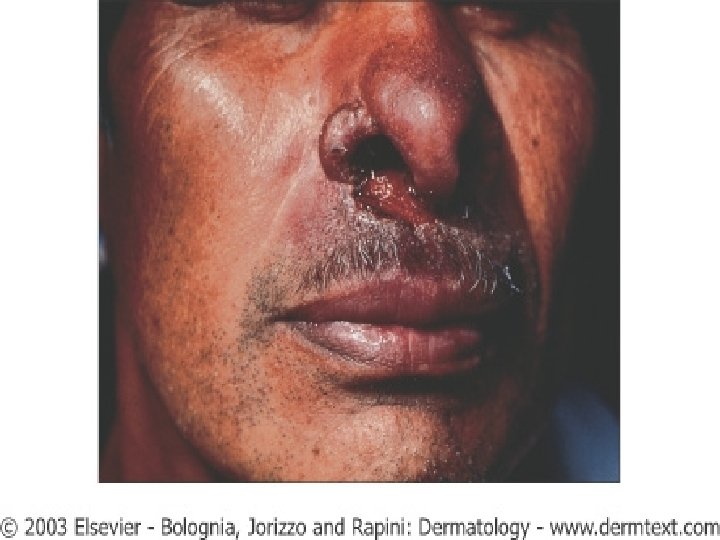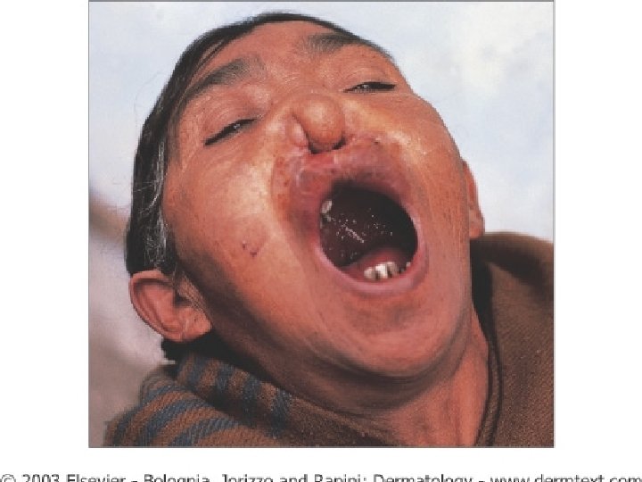 LEISHMANIASIS n n After a variable period of time ranging from months to more than 20 years, some patients will develop mucocutaneous disease. Mucosal lesions range from simple edema of the lips and nose, to perforation of nasal and laryngeal cartilage as well as the palate Additional forms include leishmaniasis recidivans, a sporotrichotic pattern and ‘dry’ erythematous plaques leishmaniasis recidivans is characterized by recurrence at the site of an original ulcer, generally within two years and often at the edge of the scar