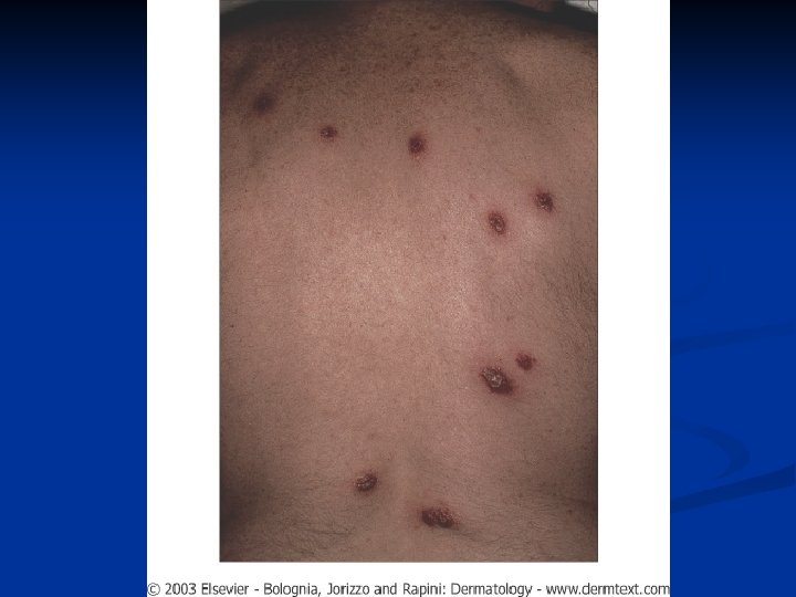 CUTANEOUS LEISHMANIASIS n n n Usually begins as a small, well-demarcated papule that may enlarge into a nodule or plaque, which may become ulcerated or verrucous. Exposed areas are most commonly involved Lesions are often solitary but may be multiple, with the formation of satellites or lymphatic spread Majority of acute cutaneous infections resolve spontaneously with scarring, but some may become chronic or disseminated Patients with disseminated form of cutaneous leishmaniasis have multiple ulcerated lesions