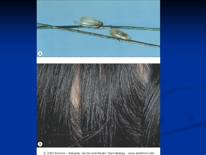 Pediculosis n n n n Most drug treatments also kill nits but do not remove them. Dead nits do not have to be removed, but drugs do not always kill all nits. Because it is not possible to distinguish between living and dead nits, doctors recommend removing them. Nonetheless, a very small percentage of children with nits in their scalp actually have lice. Removal requires a fine-tooth comb and careful searching (“nit -picking”). Because the nits are so strongly stuck to the hair, several nonprescription preparations are available to loosen them. Nits are carried away from the scalp as the hair grows. If there are no nits within 1/4 inch of the scalp, the person does not have any live lice.