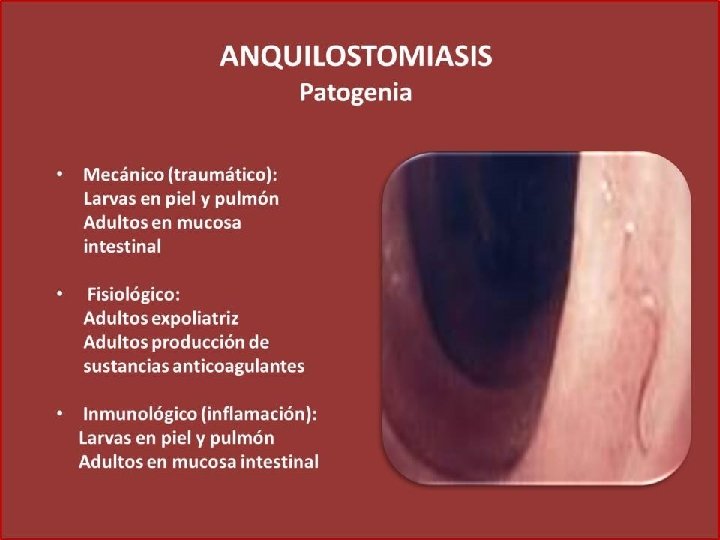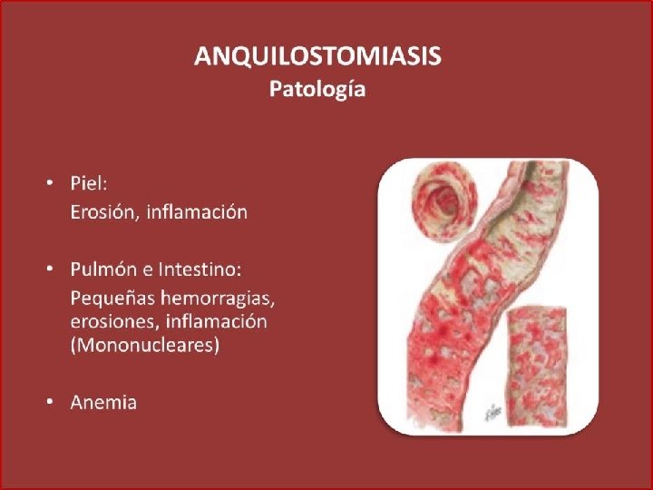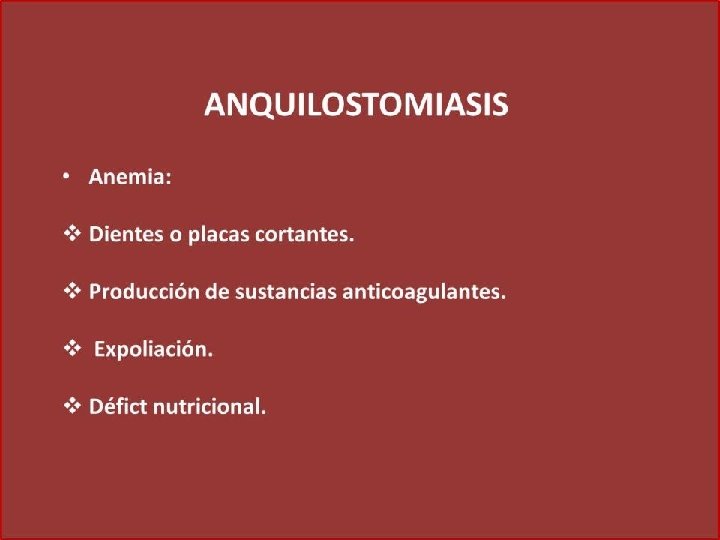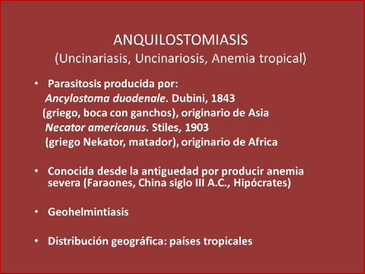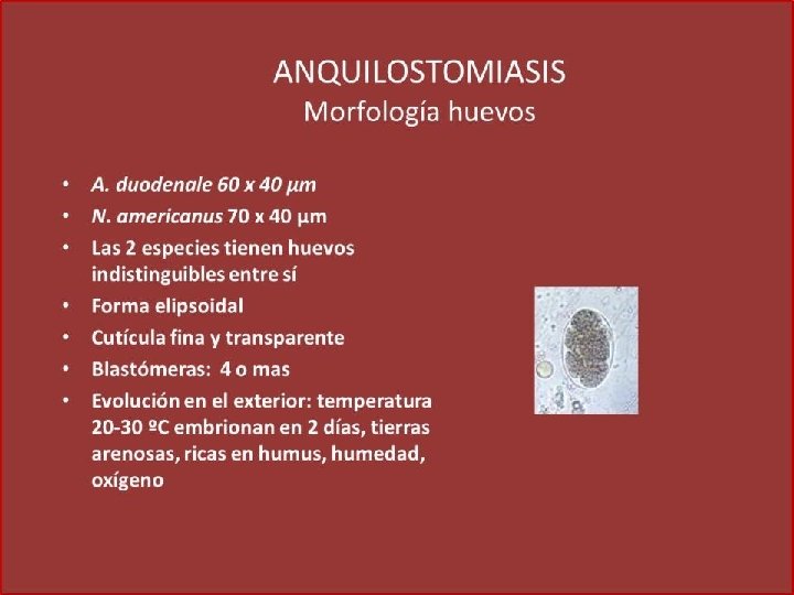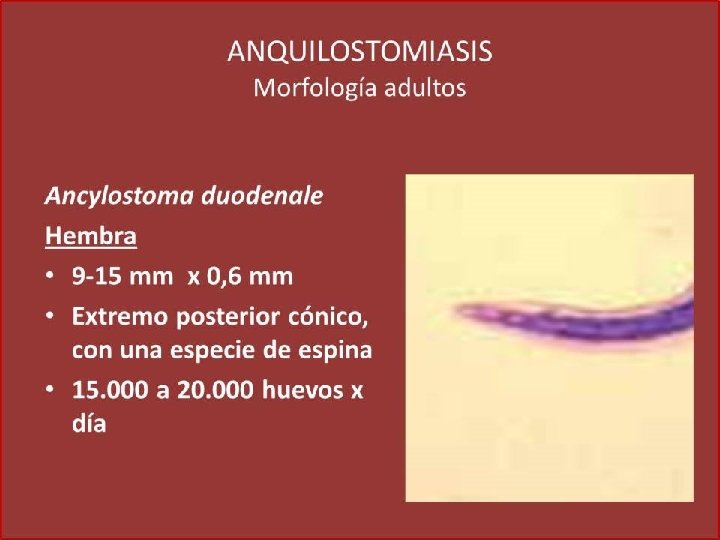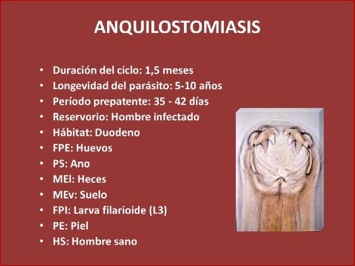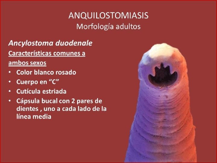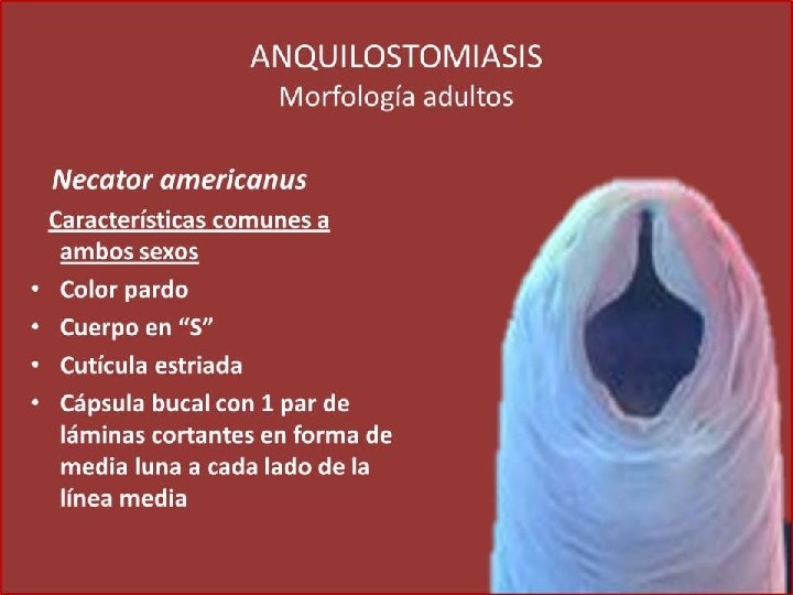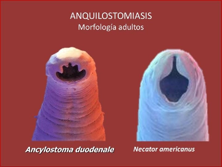 Género y especie Ancylostoma duodenale: dientes Necator americanus: placas Hábitat: parte alta del intestino delgado Estadios: huevo, larva rhabditoide, larva filariforme Forma infectante para el hombre: larva filariforme Longevidad: más de 6 años Presenta ciclo de looss Contacto con suelos contaminados con la forma infectante del parási ANQUILOSTOMOSIS, uncinariasis