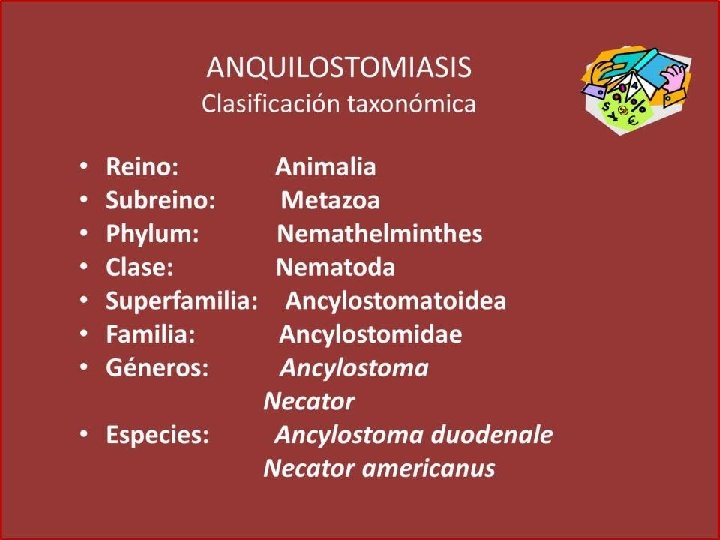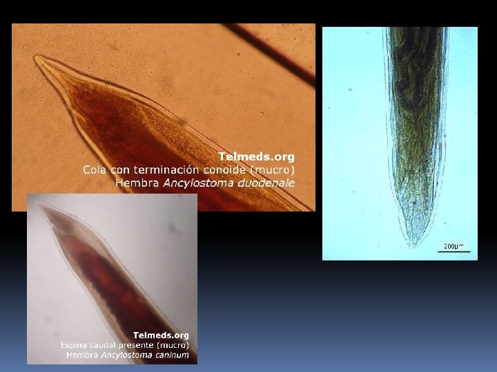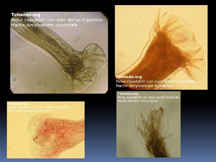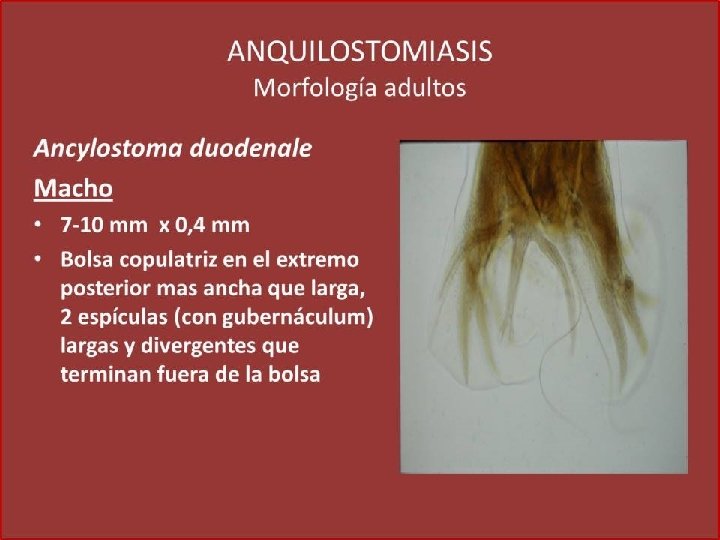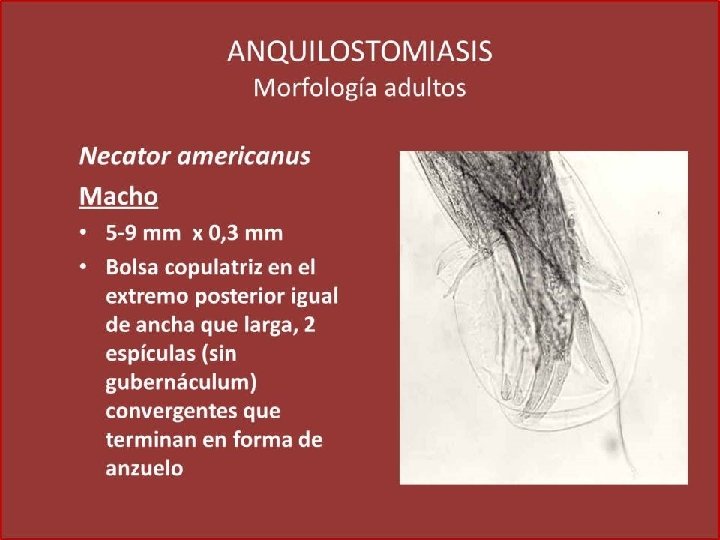 Característica Ancylostoma duodenale Necator americanus Ancylostoma caninum Cavidad Bucal (hembra y macho) Dos pares de dientes Placas cortantes semilunares Tres pares de dientes Hembra Presenta espina caudal y vulva posterior al medio del cuerpo Vulva anterior a la mitad del cuerpo y espina caudal ausente Presenta espina caudal y vulva posterior al medio del cuerpo Macho Bolsa copulatriz más ancha que larga – Rayo dorsal tripartido Bolsa copulatriz más larga que ancha – Rayo dorsal bipartido Bolsa copulatriz más ancha que larga – Rayo dorsal largo y delgado Ova Membrana hialina. De cuatro a seis blastómeras Larva filariforme Cola termina en punta. Sin cavidad bucal. Esófago filariforme. Larva rabditoide Cavidad bucal larga. Primordio genital pequeño. Esófago rabditoide Habitat Intestino delgado (parte alta). Mecanismo de transmisión Penetración activa de larva filariforme por piel. Estadio diagnóstico Huevo en heces Estadio infectante Larva filariforme Ciclo Huevo fertilizado – Huevo embrionado (L 1)- Larva rabditoide (L 2) – Larva filariforme (L 3) – Adulto – Huevo fertilizado