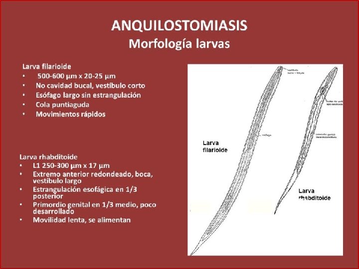 Larva filariforme Esófago alargado; no tiene cápsula bucal