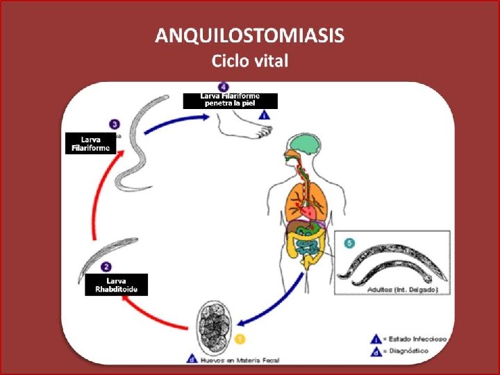 UNCINARIAS CICLO BIOLOGICO: LA LARVA FILARIFORME ES LA (FPI) LARVA DEL TERCER ESTADIO, ESTA PENETRA LA PIEL. MEDIANTE LA CIRCULACION LLEGA A CORAZON, LUEGO PASA A PULMON, ALVEOLOS. ASCIENDE POR EL ARBOL RESPIRATORIO Y EN FARINGE ES DEGLUTIDA. UNA VEZ EN ESOFAGO, DESCIENDE Y LLEGA A INTESTINO DELGADO, EN DONDE PASA EN 5 A 7 SEMANAS A ADULTO. LOS ADULTOS COPULAN, LA HEMBRA LUEGO OVIPONE (HASTA 5000 POR DIA) LOS HUEVOS SALEN JUNTO CON LAS HECES, UNA VEZ EN EL MEDIO AMBIENTE (SUELO). ECLOSIONAN DESPÚES DE 48 HORAS, LIBERANDO LA LARVA RHABDITOIDE (se alimenta). A LOS TRES DIAS SE TRANSFORMA EN LARVA RHABDITOIDE DE SEGUNDO ESTADIO. AL 8 VO DIA MUDA AL TERCER ESTADIO ORIGINANDO LA LARVA FILARIFORME (FPI)