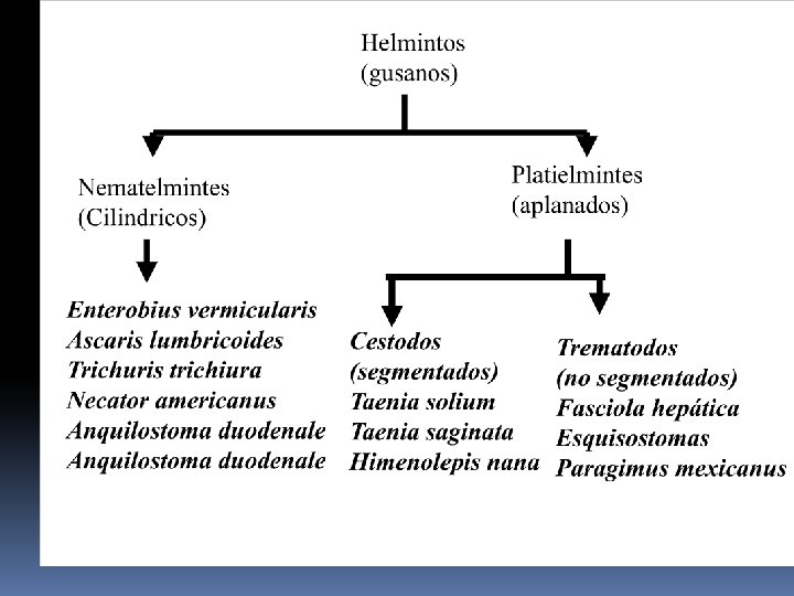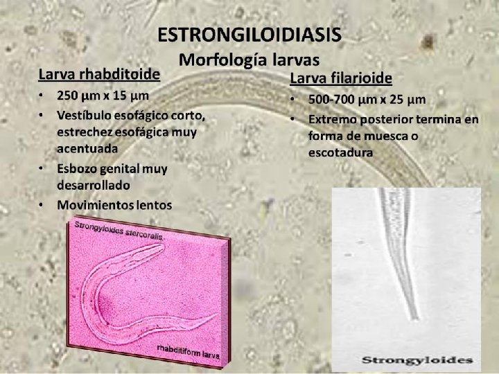 STRONGYLOIDES STERCORALIS CICLO BIOLOGICO: (ES EL UNICO PARASITO FACULTATIVO DEL HOMBRE) LA LARVA FILARIFORME ES LA FPI, PENETRA POR VIA CUTANEA, A TRAVES DE LA CIRCULACION LLEGA A CORAZON. LUEGO LLEGA A PULMON (ALVEOLOS) ASCIENDE POR VIAS RESPIRATORIAS LLEGA A FARINGE Y ES DEGLUTIDO. UNA VEZ EN ESOFAGO, SIGUE HASTA INTESTINO DELGADO, ALLI PASA A ADULTO, DONDE COPULA. LUEGO LA HEMBRA OVIPONE, LOS HUEVOS ECLOSIONAN, LIBERANDO UNA LARVA RABDITOIDE. ESTA LARVA EN LUZ INTESTINAL, ES ARRASTRADA POR EL TRANSITO FECAL, Y SALE AL EXTERIOR.