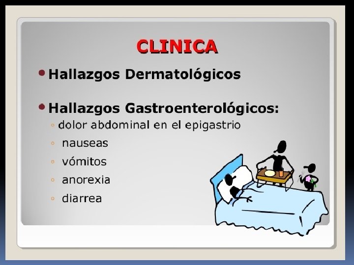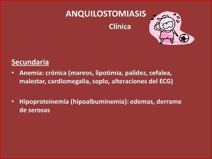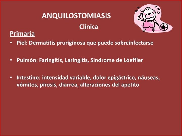 STRONGYLOIDES STERCORALIS MANIFESTACIONES CLINICAS: PIEL: HEMORRAGIA PEQUIAL, ERUPCION, INFLAMACION, PRURITO, EROTEMA, EDEMA, URTICARIA, DERMATITS. PULMON: TOS, ESPUTO, ARDOR INTRATORACICO, FIEBRE. OTROS: HEPATOMEGALIA, DIARREAS, NAUSEAS, VOMITOS, MELENA, ASTENIA, IRRITABILIDAD INTESTINAL, EVACUACIONES CON SANGRE.