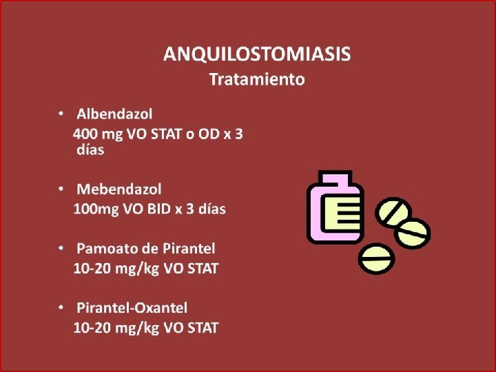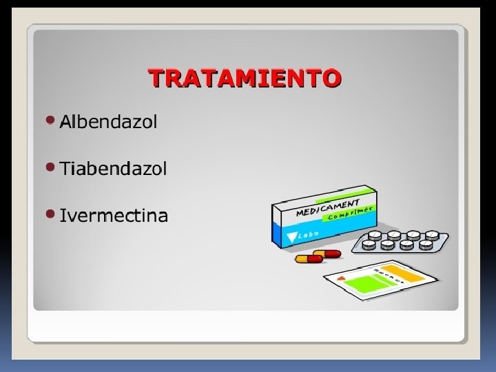 STRONGYLOIDES STERCORALIS TRATAMIENTO: TIABENDAZOL(MISTEZOL, DROFEN) Dosis: 30 mg/kg peso en niños, adultos: 50 mg /kg peso BID X 2 DIAS ALBENDAZOL: 400 mg BID POR 5 DIAS Y SE REPITE A LOS 15 DIAS
