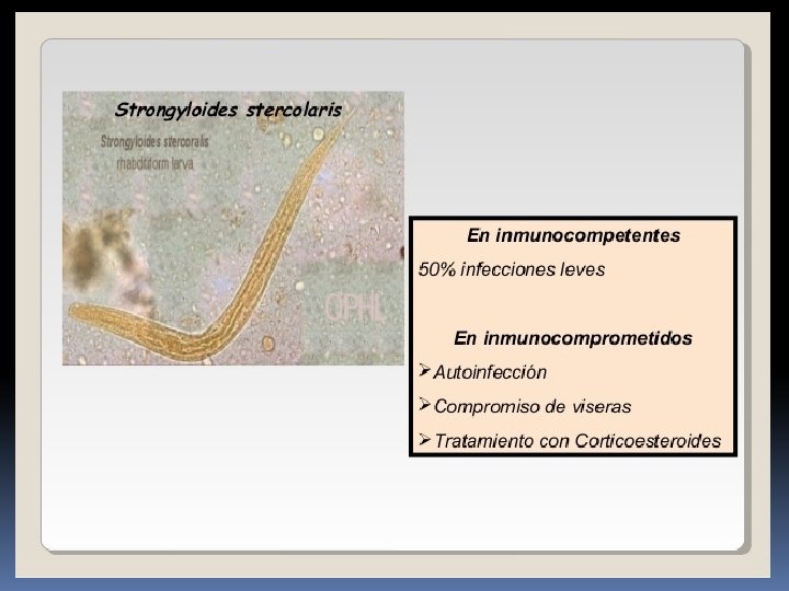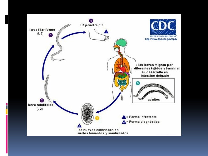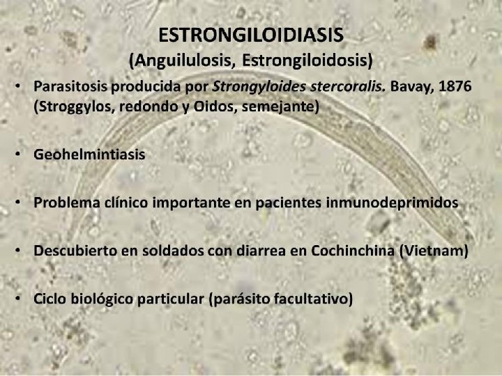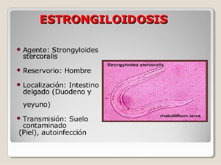 STRONGYLOIDES STERCORALIS ES EL AGENTE ETIOLOGICO DE LA ESTRONGILOIDIASIS EPIDEMIOLOGIA: ESTA NEMATODIASIS SE PRESENTA EN CLIMAS TROPICALES Y SUELOS SOMBREADOS. LA (FPI) ES LA LARVA FILARIFORME, LA CUAL ROMPE LA INTEGRIDAD DE LA PIEL. EXPERIMENTA AUTOINFECCION, LO QUE AUMENTA SU CARGA. LAS MIGRACIONES Y TURISMO HAN HECHO QUE EN LOS ULTIMOS AÑOS SE DISEMINE MAS EN VARIOS PAISES. ES MÁS SEVERA EN PACIENTES INMUNOCOMPROMETIDOS.
