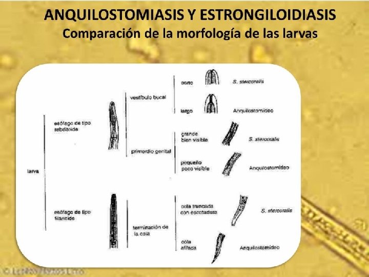 En las uncinarias la larva Rabditoide tiene cavidad bucal grande y primordio genital pequeño. En estrongiloides es lo contrario. Hábitat de la larva rabditoide: Suelo arenoso