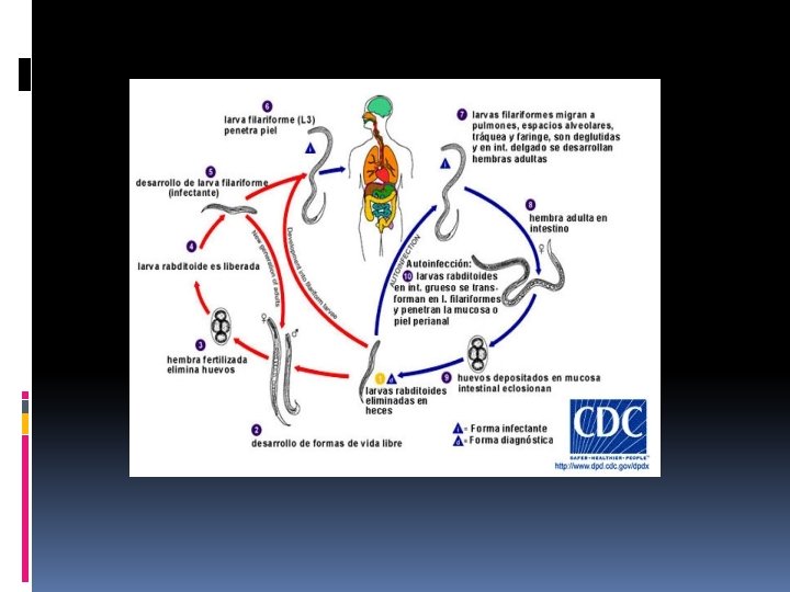 STRONGYLOIDES STERCORALIS CICLO DE AUTOINFECCION INTERNA: LAS LARVAS RABDITOIDES MUDAN A FILARIFORMES EN LUZ INTESTINAL, PENETRAN LA PARED, PASAN A LA CIRCULACION, LLEGAN A HIGADO, CORAZON, PULMON, VIAS RESPIRATORIAS, FARINGE, SON DEGLUTIDAS, LLEGAN A INTESTINO DELGADO, PASAN A ADULTOS (SE REPITE EL CICLO ANTERIOR. AUTOINFECCION EXTERNA: LAS LARVAS QUE SALEN POR VIA ANAL, PENETRAN LA PIEL PERIANAL, PASAN A LA CIRCULACION Y REPITEN EL CICLO.