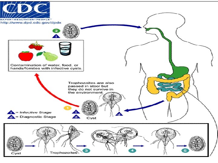 Transmissie n Orale ingestie van cysten: n via besmet water via besmet voedsel faeco orale overdracht Risicogroepen: reizigers, immuungecompromitteerden, homoseksuelen, kinderdagverblijf, instelling