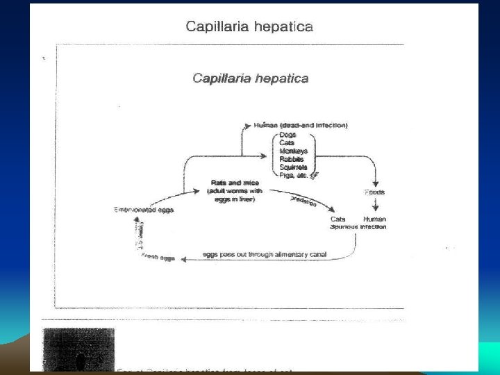 Capillaria hepatica adult worms reside in the liver of various animals, especially rats. The females produce eggs that are retained in the liver parenchyma. When the infected animal is eaten by another animal, the eggs are released by digestion, excreted in the feces of the second animal, and become embryonated in the soil. Alternately, the eggs can be released following the death and decomposition of the first animal, and mature in the soil. Following ingestion by a subsequent host, these infective eggs release larvae in the intestine that migrate through the portal circulation to the liver, where they develop into adults.