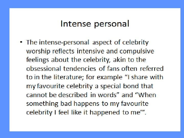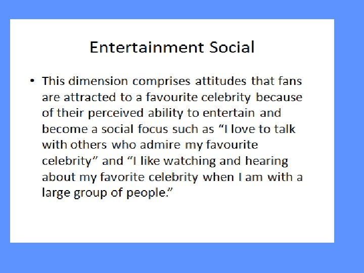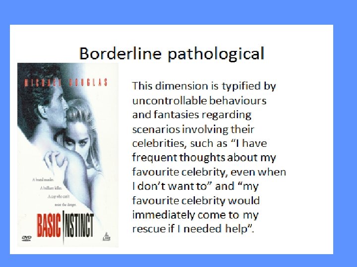 Celebrity Attitude Scale 1. Entertainment-Social: talk with friends about 2. 3. celebrities/gossip. Intense-Personal: intensity of feelings for celebrities. Can become an obsession. Borderline-Pathological: potentially harmful aspects of feelings for celebrities. Can lead to uncontrollable behaviours e. g. stalking. Most people never move beyond ES level but PSR’s can become addictive.