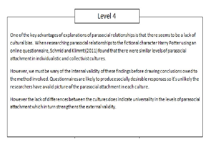 Parasocial relationships may be beneficial. . Gabriel (2008) • Ppts given questionnaire measuring their self esteem • Ppts then asked to write essay about their favourite celebrity • Then given the questionnaire again • Findings: Self esteem increased following the essay when compared to before • This suggests, they may have incorporated the celebrity characteristics into themselves, thus boosting self esteem • This is something which they may not be able to do in face-to-face relationships, due to the fear of rejection stopping them getting close to people