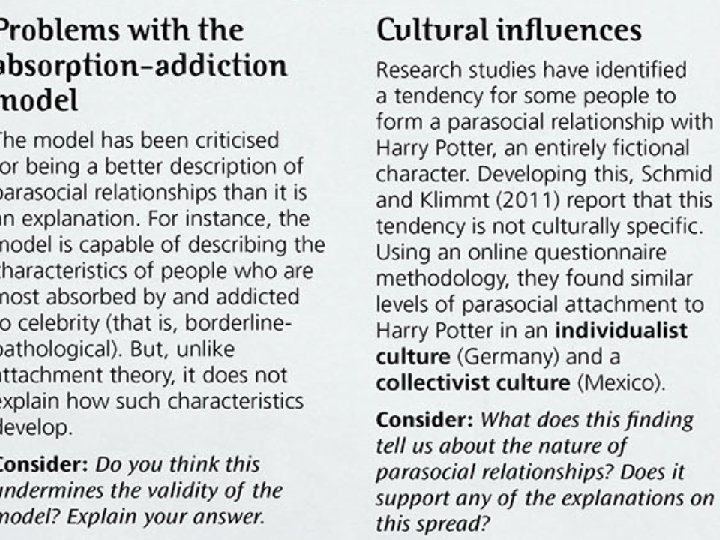 Challenge Explain two limitations of the absorption addiction model of parasocial relationships. (Total 6 marks)