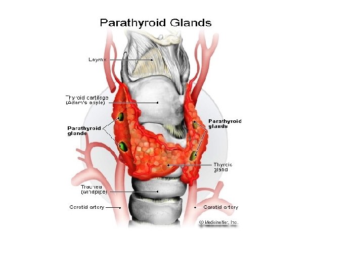 Hhypoparathyroidism • Tetany can be overt or latent • Manifested by 2 signs : • Chorostek’s sign: Tapping the facial nerve as it emerge from the parotid gland in front of the ear causes contraction of facial muscles. • Trousseau’s sign : • Arresting (stopping ) blood flow to the forearm for fe minutes ( e. g. , by sphygmomanometer ) causes flexion at the wrist, thumb and metacarpophalangeal joints.