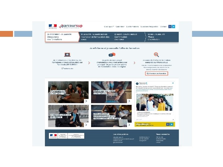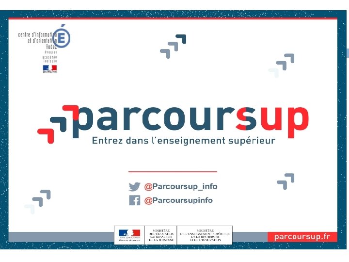 Qu’est-ce que PARCOURSUP ? procédure d’admission en première année des formations post-bac � Pour trouver des informations sur les formations (Dates des journées portes-ouvertes, attendus, examens du dossiers, des stats, des « contacts » …) � Pour saisir des vœux de poursuite d’études � Pour recevoir et répondre aux propositions d’admission