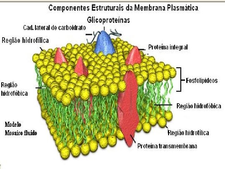 Modelo de Singer e Nicholson ou mosaico fluido • Mais aceito atualmente - 1972 • Bicamada lipídica também está presente • Proteínas deslocam-se pela membrana • Por isso a membrana é fluida sendo este modelo chamado de mosaico fluido • Facilita as funções das proteínas • Aspecto trilaminar