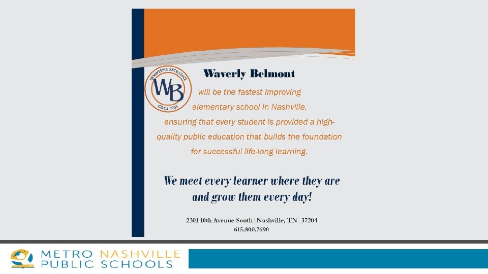 Parent Survey (136 responses)Favorability Ratings I feel welcome at Waverly Belmont Elementary School. 95% The front office staff at Waverly Belmont Elementary School is friendly. 83% School events are at times and places that are convenient for my family. 85% I am comfortable bringing up concerns to teachers. 97% I am comfortable bringing up concerns to the Assistant Principal or Principal. 82% Waverly Belmont Elementary School provides information about what students are expected to learn. 85% Teachers provide me with weekly communication about what students are learning. 91% Waverly Belmont Elementary School provides me with regular feedback about student Progress. 91% My child(ren) feels academically challenged at Waverly Belmont Elementary School. 82% Waverly Belmont Elementary School meets the Social and Emotional needs of my child(ren). 89% My child(ren) feels safe at Waverly Belmont Elementary School. 96%