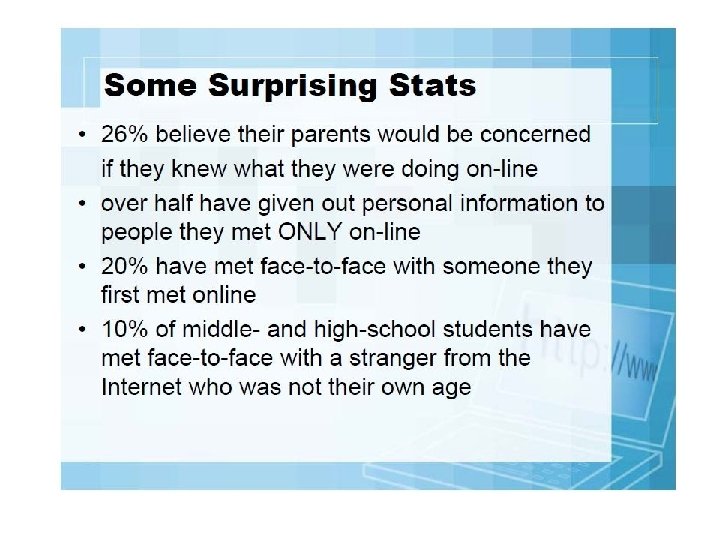 Statistics Research Unlimited, Oct. 2005, con’t. 56% of teens said that they have been asked personal questions (such as their age, sex, or location) online by someone they have never met. One fourth (27%) of teens report that they have talked online about sex with someone they have never met. 27% of teens said that they’ve known a friend to actually meet someone they only knew online. One in five (21%) reported that a person they only knew through online contact has asked to meet them.