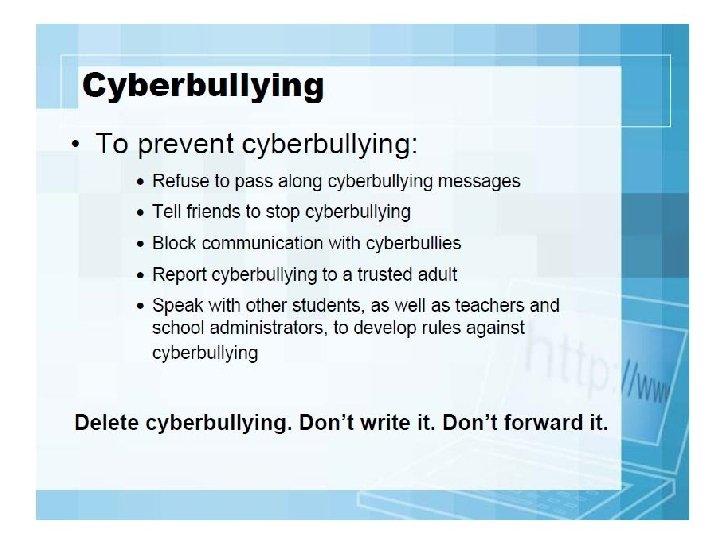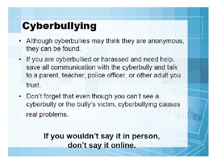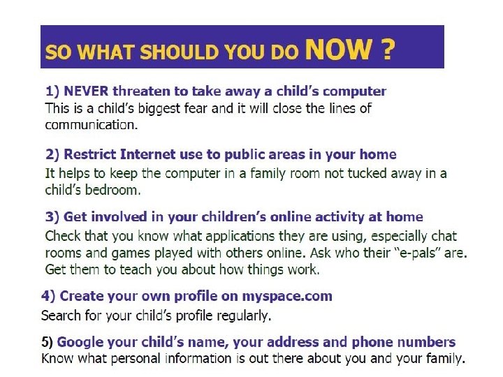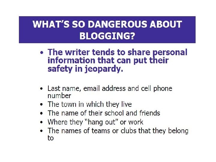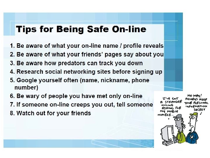 Teens need to learn: they are vulnerable to predators how dangerous it is to post personal information and photos online how to remain as anonymous as possible when using the Internet to avoid endangering themselves how to recognize and repel the advances of a predator what to do and who to talk to if they feel they have been approached by a stranger online that it is NEVER a good idea to meet in person someone they have “gotten to know” online