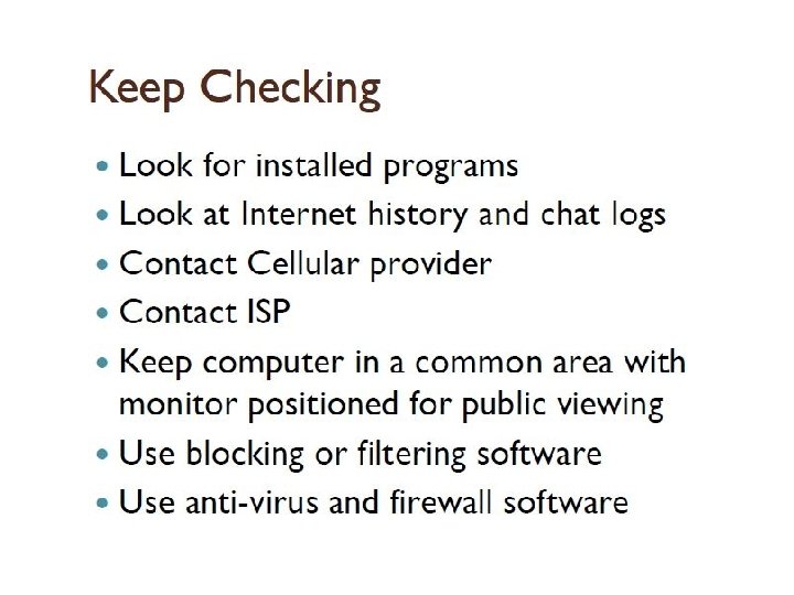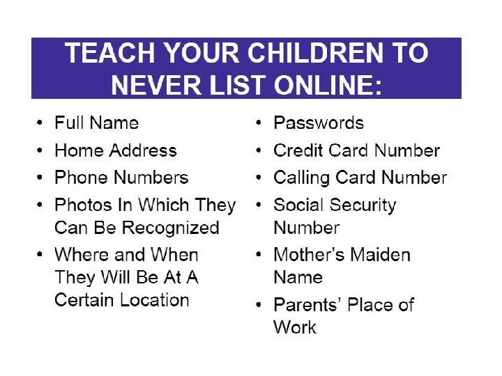 Keep Current Know your child's email addresses, passwords, IM usernames for all sites and software they use Sit with your child and have them show you any sites or software you are unfamiliar with