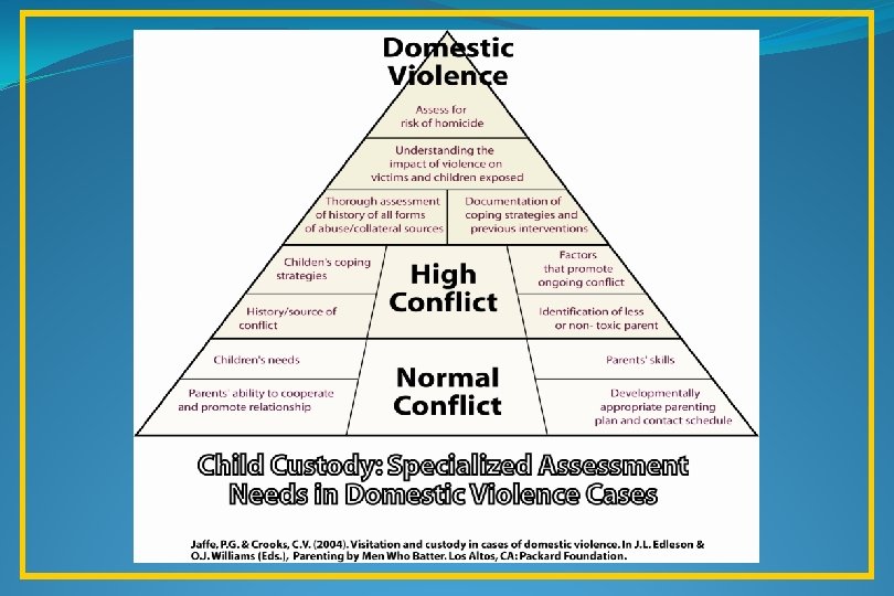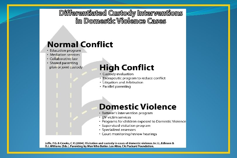 Parenting Arrangements after Violence Abuse (Child or Adult Partner) Evaluated Risk to Children or Caregiver Battering High Common Couple Aggression / No child maltreatment Low Co-parenting High Conflict Nature, Frequency & Severity of Family Violence Terrorism/ Stalking Parallel Parenting Supervised Exchange Supervised Visits No Visitation