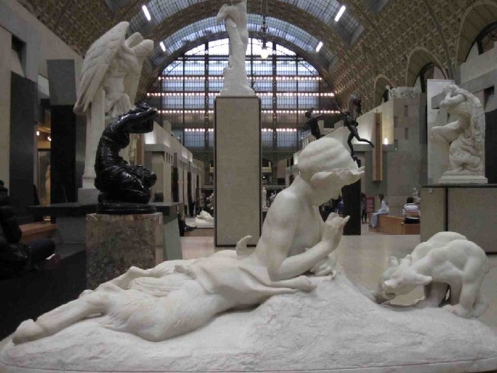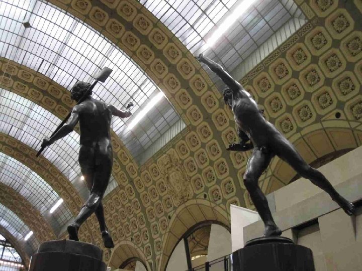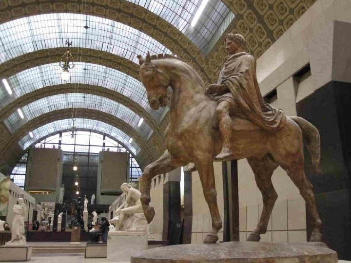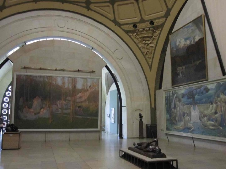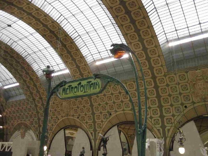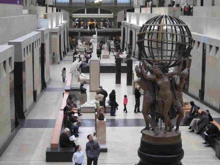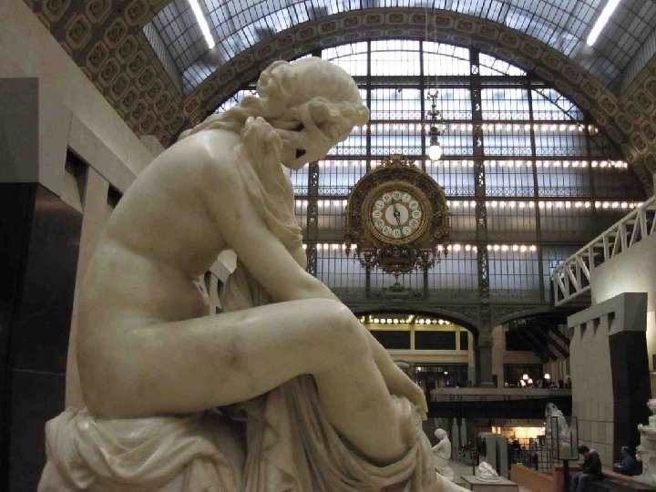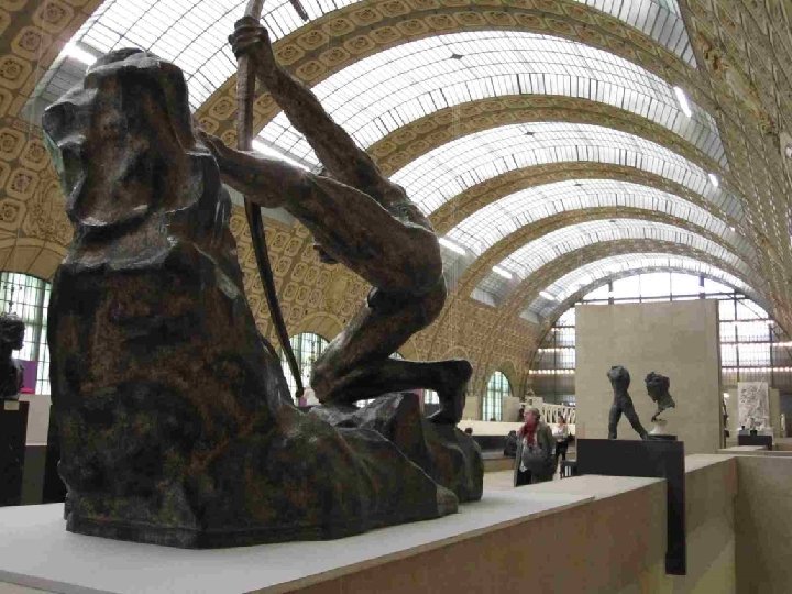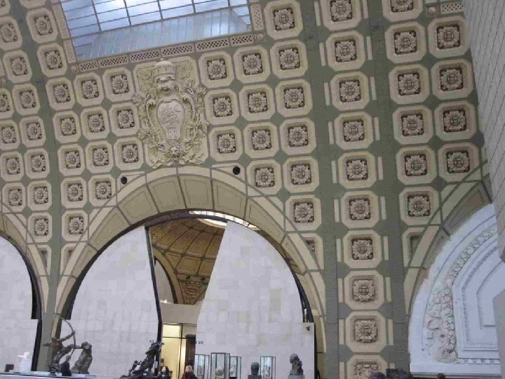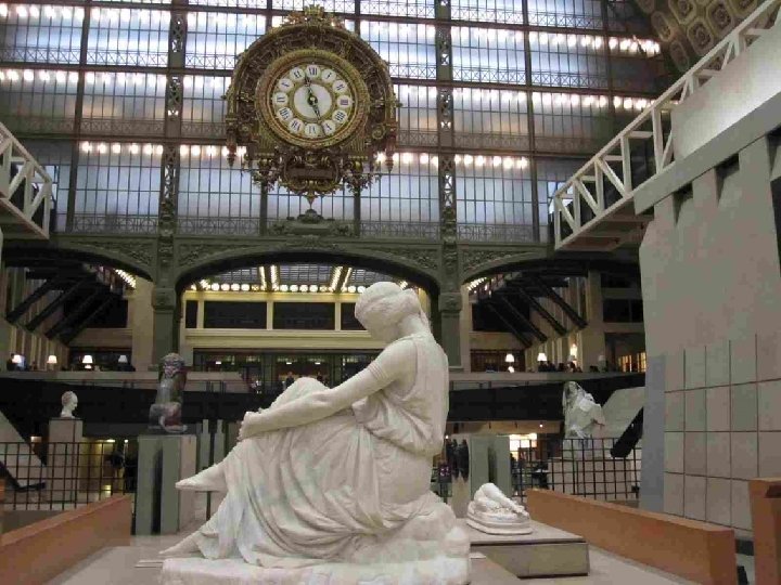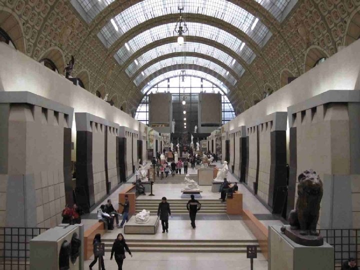 LA VOCATION DU MUSEE D’ORSAY Il fait face aux Jardins des Tuileries et au Musée du Louvre. Sous et autour d’une nef centrale de 140 mètres de long et 35 mètres de haut couverte d’une immense verrière qui diffuse une belle lumière zénithale et décorée de 1600 caissons à rosaces en staff, et sur trois niveaux, ce lieu destiné à l’origine au passage, est devenu un lieu propice à la conservation et à la contemplation. L’intérêt du musée est loin de se limiter aux œuvres impressionnistes qui ont établi sa réputation, mais à confronter peinture, sculpture, architecture, arts décoratifs et photographie, bref tout ce qui entre sous le vocable de « arts plastiques » , au cours de la seconde moitié du XIXe siècle (1848 -1914) et qui concerne, à quelques rares exceptions près, presque exclusivement le patrimoine artistique français. Chronologiquement, Orsay fait donc le lien entre le Louvre (art antérieur à 1848) et le Musée National d’Art Moderne (XXe siècle), installé au Centre Georges Pompidou en 1977.