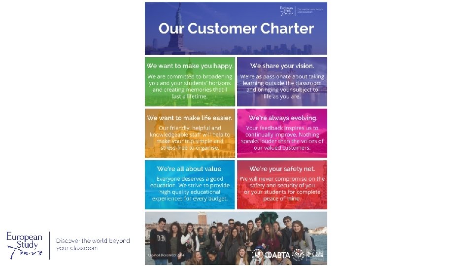 Financial Protection and Safety Management European Study Tours is fully bonded by the Association of British Travel Agents which means you have the benefit of ABTA’s assistance and Code of Conduct as well as offering financial protection for your money. In line with Df. ES guidelines and after consulting with Ro. SPA (The Royal Society of Prevention of Accidents) European Study Tours have developed a Safety Management System, which helps ensure elements of your tour remain of a high standard. The Safety Management System covers the following elements of your tour: • Accommodation • Transport • 24 Hour Emergency Cover • Tour Operator Liability Insurance • Pre-Tour Inspection Visit • Pre-Tour Safety Information