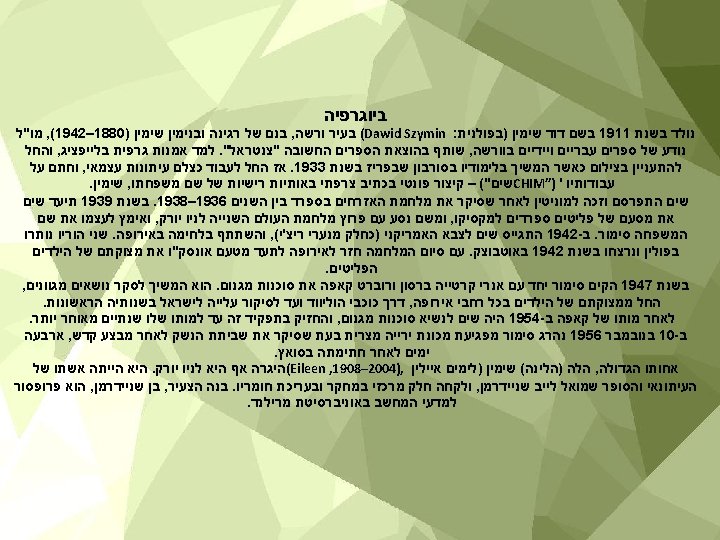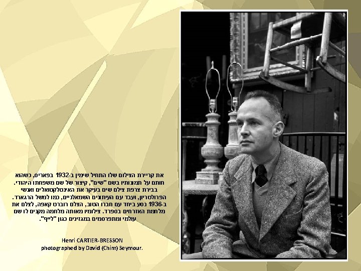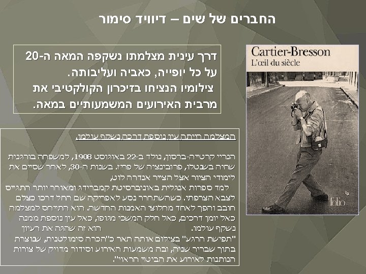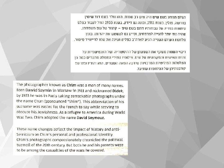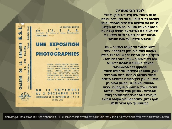 : מקורות https: //davidseymour. com/ שים )דייוויד סימור( מוזיאון התפוצות : לוכד ההיסטוריה http: //www. israelhayom. co. il/article/466735 https: //he. wikipedia. org/wiki https: //en. wikipedia. org/wiki/David_Seymour_(photographer ) https: //www. pinterest. com/pin/428404983275541266 / https: //pro. magnumphotos. com/C http: //www. loc. gov/pictures/item/2014646756 / Clarita-Efraim pps: www. clarita-efraim. com chefetze@netvision. net. il