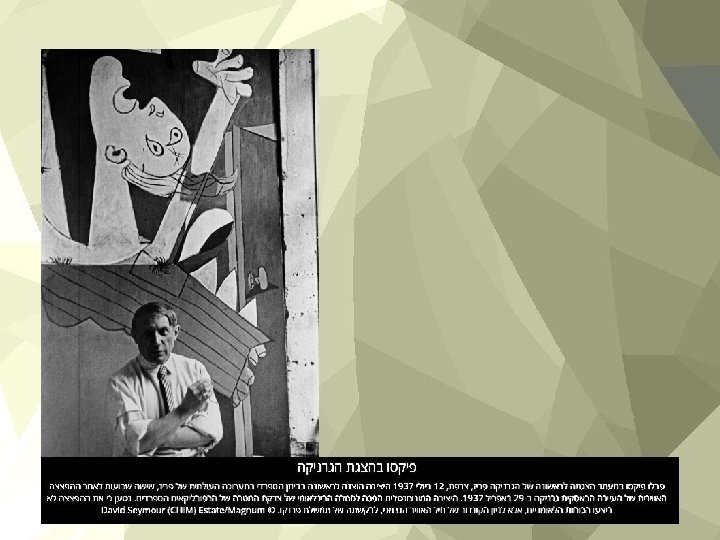Pablo Picasso in front of Guernica, Paris In late May 1937, during a brief hiatus from his war coverage, Chim collaborated with Henri Cartier-Bresson on an issue of Regards dedicated to the Paris World's Fair. Chim made this wellknown portrait of Pablo Picasso standing before Guernica shortly after the painting was unveiled in the fair's Spanish Pavilion. Picasso's anti-Franco screed was motivated by the Nazi air force's merciless pummeling of the Basque town of Guernica on April 26. Over the course of three hours, German planes dropped an unprecedented 100, 000 pounds of high explosive and incendiary bombs that leveled the historic town and caused 1, 600 civilian casualties. The usually apolitical Picasso made no bones about what lay behind his work during this period: "I am expressing my horror of the military caste which is now plunging Spain into an ocean of misery and death. " Chim's portrait depicts Picasso as both an artist and a Republican partisan. The composition projects Picasso into the painting and suggests the artist's identification with the immense, horrorstricken figure above him. Picasso's crossed arms underscore his defiance, as does the ominous shadow that falls across half his face.