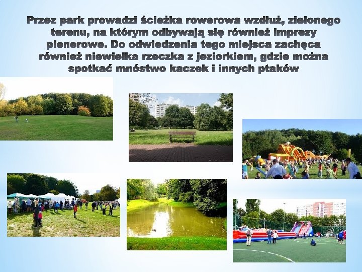 W parku, oprócz jazdy rowerem, możemy podziwiać piękno przyrody, odpocząć na ławce, pospacerować pięknymi alejkami.