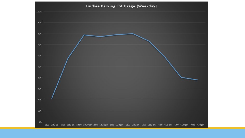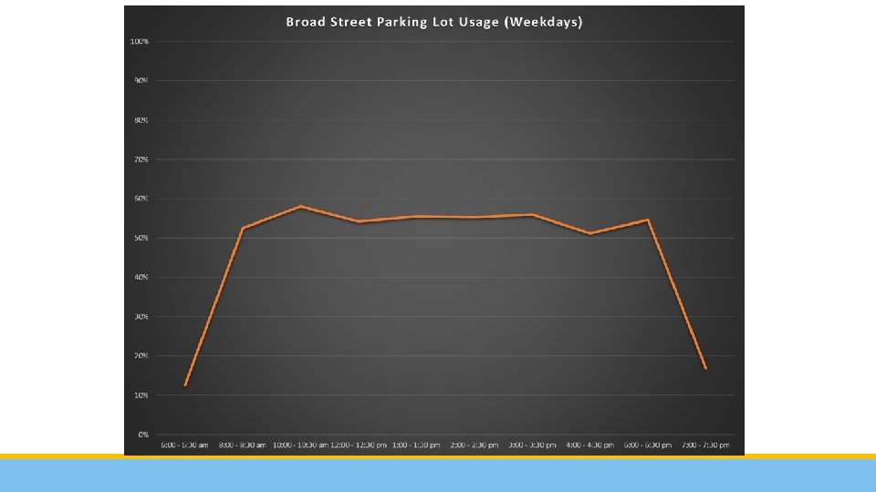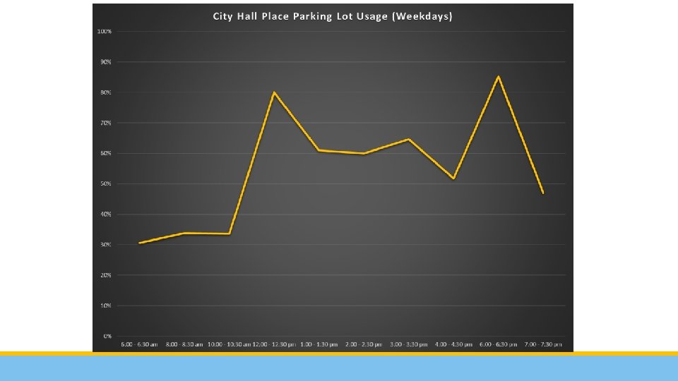 Lowest and Highest Measured Utilization Parking Lot Lowest Measured Utilization Highest Measured Utilization Durkee Street 20% (6: 00 – 6: 30 am) 86% (2: 00 – 2: 30 pm) Broad Street 5% (6: 00 – 6: 30 am) 108% (6: 00 – 6: 30 pm) Court Street 14% (6: 00 – 6: 30 am) 91% (6: 00 – 6: 30 pm) City Hall Place 18% (6: 00 – 6: 30 am) 100% (6: 00 – 6: 30 pm)