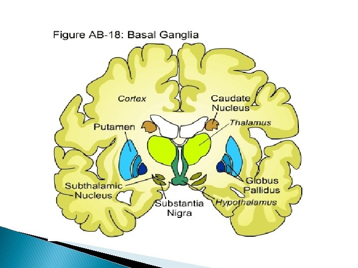 Anatomy Extrapyramidal system – eliminates unwanted movements for smooth voluntary motor activity 1. Basal ganglia 2. Subthalamic nucleus 3. Substantia nigra 4. Reticular formation 5. Red nucleus