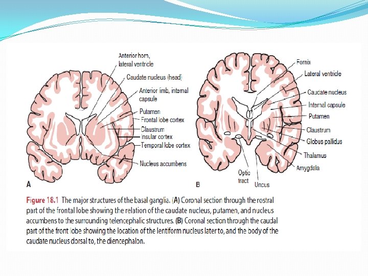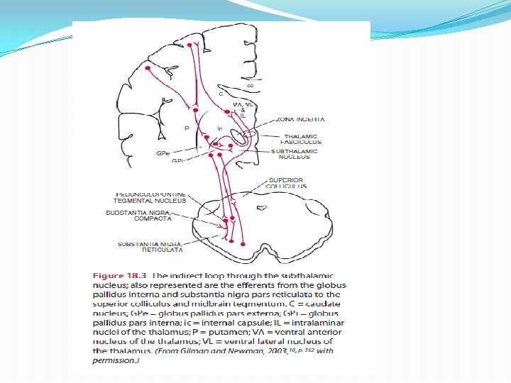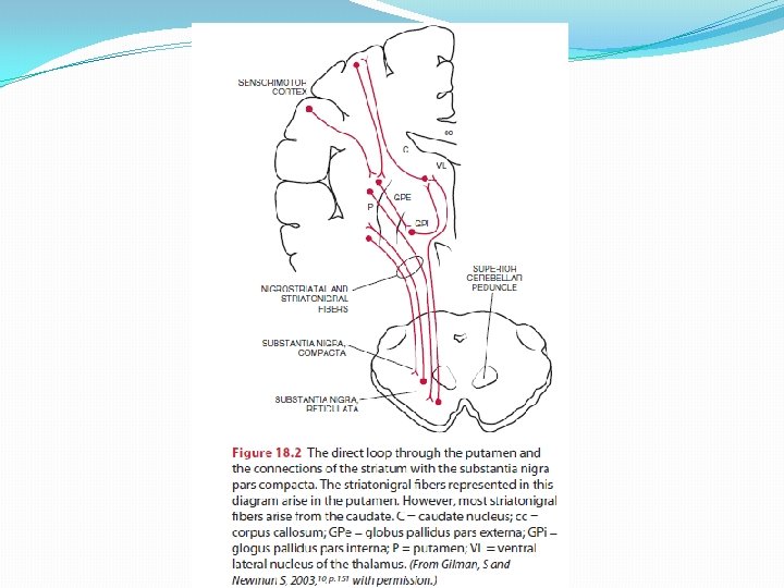 PATHOPHYSIOLOGY � The BG is a network of subcortical nuclei consisting of the caudate nucleus, the putamen, the globus pallidus, and the subthalamic nucleus along with the substantia nigra. The caudate and the putamen together are called the striatum (Fig. 18. 1). � The BG engages in a number of parallel circuits or loops, only a few of which are motor. � The direct motor loop through the BG consists of signals transmitted from the cortex to putamen to globus pallidus, to ventrolateral (VL) nucleus of the thalamus, and back to cortex (supplementary motor area [SMA]) (Fig. 18. 2). This VL-SMA connection is excitatory and facilitates discharge of cells in the SMA. he BG thus serves to activate the cortex via a positive-feedback loop and assists in the initiation of voluntary movement. Inhibition of the thalamus by the BG is thought to underlie the hypokinesia seen in PD. � An indirect loop through the BG involves the subthalamic nucleus, the globus pallidus interna, and substantia nigra pars reticulata to the superior colliculus and midbrain tegmentum (Fig. 18. 3). � This indirect loop serves to decrease thalamocortical activation. � The BG projection to the superior colliculus assists in regulation of saccadic eye movements. � The BG projection to the reticular formation assists in the regulation of trunk and limb musculature (via extrapyramidal pathways) sleep and wakefulness, and arousal. Other circuits in the BG are involved with memory an cognitive functions.