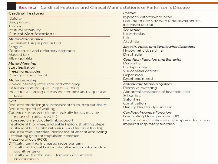 � Parkinson’s disease (PD) is a progressive disorder of the central nervous system (CNS) with both motor and nonmotor symptoms. � Motor symptoms include the cardinal features of rigidity, bradykinesia, tremor, and, in later stages, postural instability. � Nonmotor symptoms may precede the onset of motor symptoms by years. � Early symptoms can include loss of sense of smell, constipation, rapid eye movement (REM) sleep behavior disorder, mood disorders, and orthostatic hypotension. � Other nonmotor symptoms include altered bladder function, excessive saliva, integumentary changes, difficulty speaking and swallowing, and cognitive problems (slowed thinking, confusion, and in some cases dementia). � Onset is insidious with a slow rate of progression. � Disruptions in daily functions, roles, and activities, as well as depression, are common in individuals with PD.