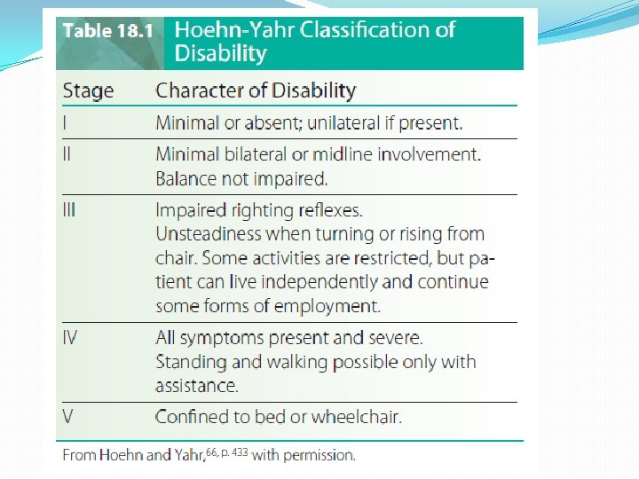 Hoehn-Yahr Classification of Disability Scale �An estimate of the stage and severity of the disease can be made using a staging scale. �The most widely used in clinical practice and research trials is the Hoehn-Yahr Classification of Disability Scale �It provides a broad measure for charting the progression of the disease using motor signs and elements of functional status. �Stage I is used to indicate minimal disease involvement, whereas stage V is indicative of severe deterioration in which the patient is confined to bed or a wheelchair.