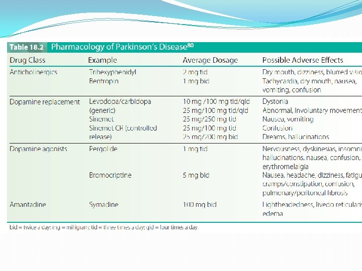MEDICAL MANAGEMENT �Medical management is directed at slowing disease progression using neuroprotective strategies, and symptomatic treatment of motor and nonmotor symptoms. �Management becomes increasingly more challenging over time for patients with moderate and advanced disease (i. e. , Stage III or higher on the Hoehn-Yahr Classification of Disability Scale).
