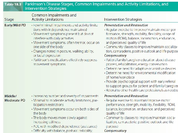 � A referral for physical therapy is often delayed at this stage, although benefits could clearly be obtained in improving fitness levels and delaying or preventing indirect impairments. Patients are typically seen on an outpatient basis. � During the middle stage of the disease, symptoms are more readily apparent and activity limitations emerge. � The patient may still be independent in gait and ADL, although performance is slowed and less efficient. Some assistance may be required. � The patient may be seen as an outpatient, during home care, or during a brief inpatient admission. There are numerous benefits to rehabilitation services. � Exercise training programs have been shown to be effective for patients with mild to moderate � PD in improving motor performance. � Perceived quality of life and subjective well-being are also improved. � Family and caregiver instruction is intensified to assist the patient in remaining as functionally independent as possible