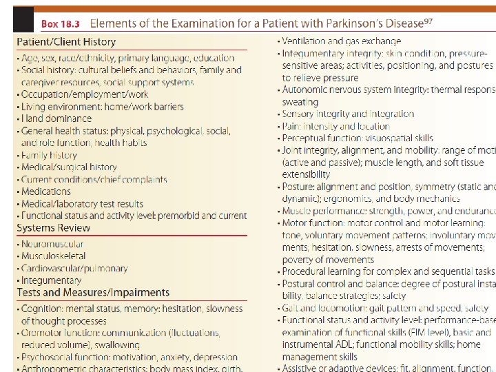PHYSICAL THERAPY EXAMINATION AND EVALUATION � A comprehensive examination is required to determine the level of impairments and degree of function. � Subsequent reexamination at specified intervals is used to distinguish change in status as well as effects of treatment. � Data are obtained from the history, systems review, and relevant tests and measures (Box 18. 3). � The selection of examination procedures and instruments is determined by the patient’s unique status. � The severity of problems, stage of disease, age, phase and setting of rehabilitation, and other factors must all be taken into account in structuring the examination and evaluating data. � During the early and middle stages of PD, measures of impairment and physical performance are relatively stable. � During late stages of the disease and under conditions of fluctuating symptoms with pharmacological instability, measures can be expected to be less stable.