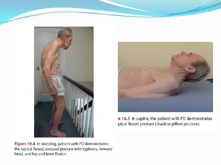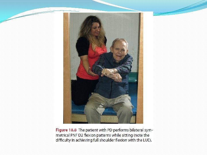 � A yoga sequence can be used effectively to focus attention on developmental postures, core stability, and stretching of structures that are traditionally restricted with PD, as well as to promote relaxation (Appendix 18. B). � Patients with PD have a minimum of energy to expend and multiple clinical problems. hey may benefit from ROM exercises in physiological patterns of motion. � For example, PNF patterns combine several motions at once while emphasizing rotation, a movement component typically lost early in PD. � In the UEs, bilateral symmetrical D 2 flexion patterns are ideal in promoting upper trunk extension and in counteracting kyphosis. � Unilateral bridging with trunk rotation, bilateral bridging, and high-kneeling with anterior pelvis translation can all be used to stretch tight hip flexors and strengthen spinal and hip extensors. � In the LEs, hip and knee extension should be emphasized, ideally in a D 1 extension pattern (hip extension, abduction, internal rotation) to counteract the typical flexed, adducted position of the LEs.