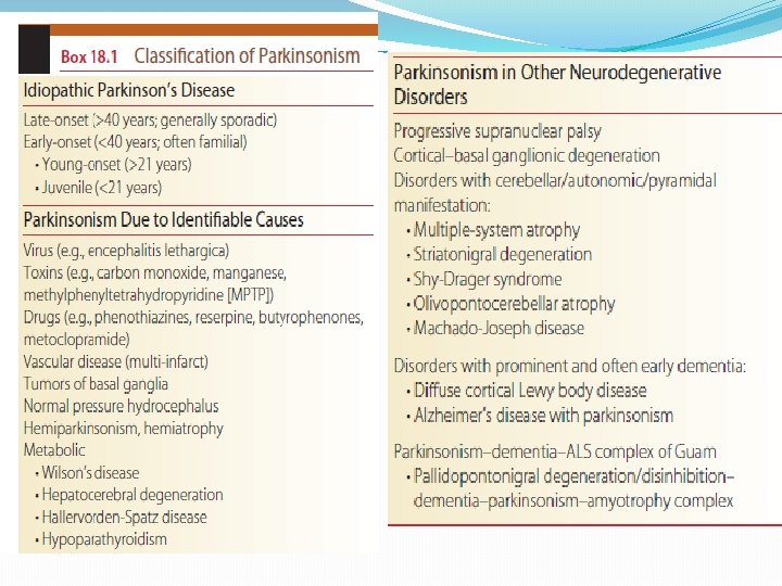 Secondary Parkinsonism; Drug. Induced Parkinsonism (DIP) � A variety of drugs can produce extrapyramidal dysfunction that mimics the signs of PD. hese drugs are thought to interfere with dopaminergic mechanisms either presynaptically or postsynaptically. � They include: 1. neuroleptic drugs such as chlorpromazine (horazine), haloperidol (Haldol) thioridazine (Mellaril), and thiothixene (Navane); 2. antidepressant drugs such as amitriptyline (Triavil), amoxapine (Asendin), and trazodone (Desyrel); and 3. antihypertensive drugs such as methyldopa (Aldomet) and reserpine. � High doses of these medications are particularly problematic in the elderly. Withdrawal of these agents usually reverses the symptoms within a few weeks, although in some cases the effects can persist and may be related to subclinical PD. � Parkinsonism can be caused in rare cases by metabolic conditions, including disorders of calcium metabolism that result in BG calcification. hese include hypothyroidism, hyperparathyroidism, hypoparathyroidism, and Wilson’s disease.