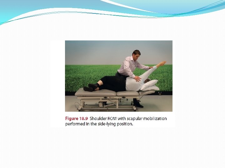 Flexibility Exercise � The purpose of flexibility exercise (stretching) is to improve ROM and physical function. � A combination of static (PROM), dynamic (AROM), and facilitated PNF exercises is used to achieve maximum ROM. � Flexibility exercises should be performed a minimum 2 to 3 days per week and ideally 5 to 7 days per week. � A minimum of 4 repetitions per stretch held for 15 to 60 seconds is recommended. � Special consideration should be given to stretching common areas of limitation (Table 18. 4). � Stretching can be combined with joint mobilization techniques to reduce tightness of the joint capsule or of ligaments around a joint (Fig. 18. 9). � By using selected grades of accessory movement, both improved ROM and decreased pain can be achieved. � The stretching will be more effective if the muscles have been warmed with active exercise or with an external heating modality. � Stretching exercises are an important component of the HEP. � The patient and caregiver should be instructed in the appropriate stretching exercises