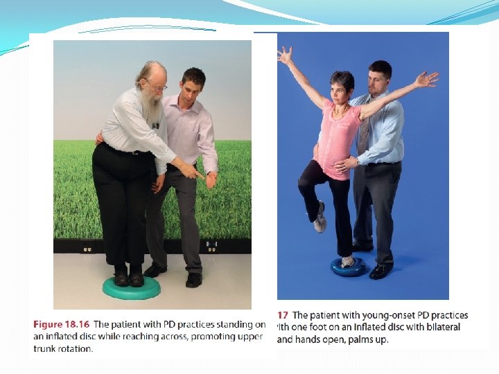 � Sit-to-stand (STS) is a difficult activity for many patients with PD, especially with moderate or advanced disease or when in the “off” state. Issues in poor dynamic stability and inadequate limb support contribute to falls. � Patients demonstrate poor timing in controlling their COM forward velocity, which tends to be slower. � Insufficient upward momentum (LE extension torques) in standing up is also problematic. � Other factors include level of agonist-antagonist coactivation and rigidity. � STS training begins with the patient scooting to the edge of the mat and placing both feet under the knees and apart. � Forward trunk flexion can be enhanced through initial rocking, which encourages relaxation. � Cueing strategies (e. g. , counting, placing one hand between the patient’s shoulder blades) can be used to assist the forward lean. � Sitting on an inflated disc can also assist in the forward weight shift and seatoff. Standing-up is enhanced by improved LE muscle strength.