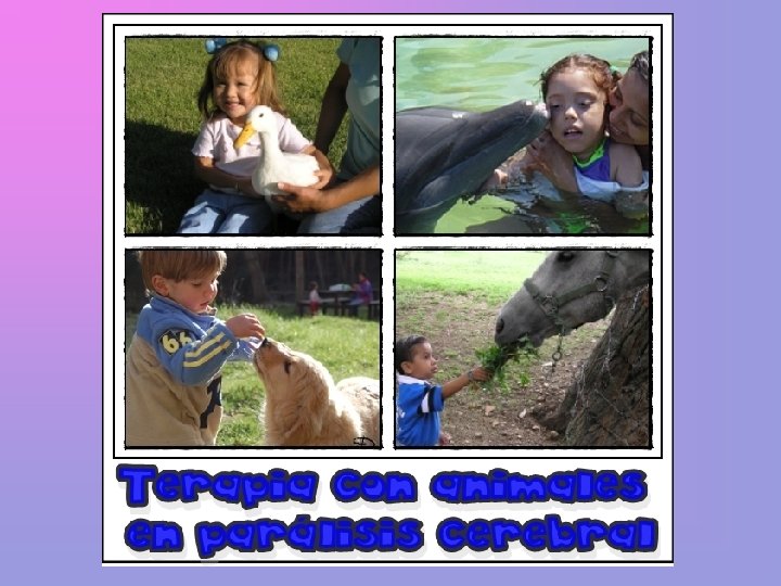 Terapias con Perros El perro es el animal terapeuta por excelencia. Su especial naturaleza nos ofrece una gran variedad de recursos terapéuticos que le ha llevado a ser el animal más utilizado en las Terapias Asistidas con Animales. Las principales ventajas del uso de perros como coterapeutas en intervenciones de TAA son: su especial forma de percibir, la accesibilidad para el contacto físico directo, su fácil manejo y transporte, que son animales muy interactivos y demandantes, así como las características propias de la especie canina. Beneficios en personas con parálisis cerebral. • Mejoras en la actitud. • Aumento de la iniciativa. • Mayor motivación. • Mayor atención y concentración.