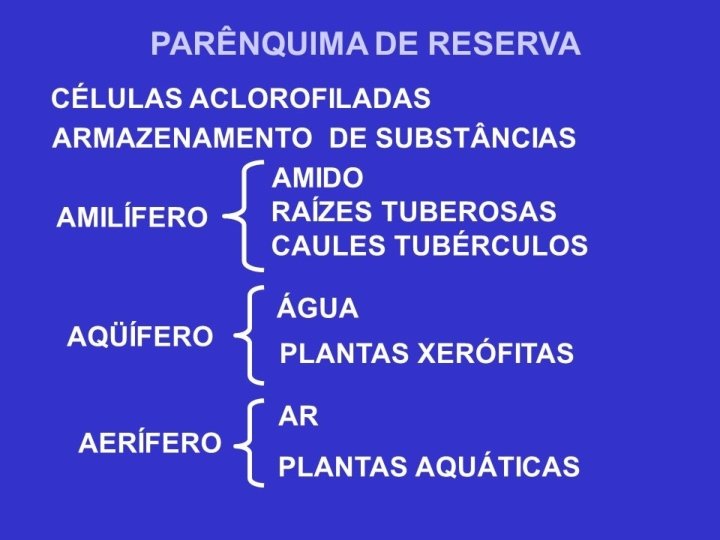 Os parênquimas de reserva que são tecidos que predominam em certos órgãos, tuberosos (caules, raízes, frutos) e nas sementes. Existem três tipos básicos: aqüífero, aerífero e amilífero.