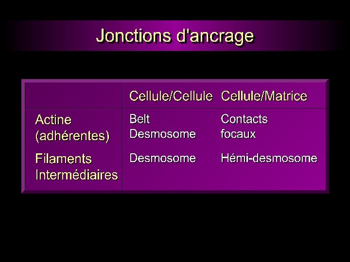 • Jonctions d'ancrage dans un épithélium. Jonction des éléments du cytosquelette d'une cellule à ceux d'une autre cellule ou de la matrice extra cellulaire Fig 19 -7