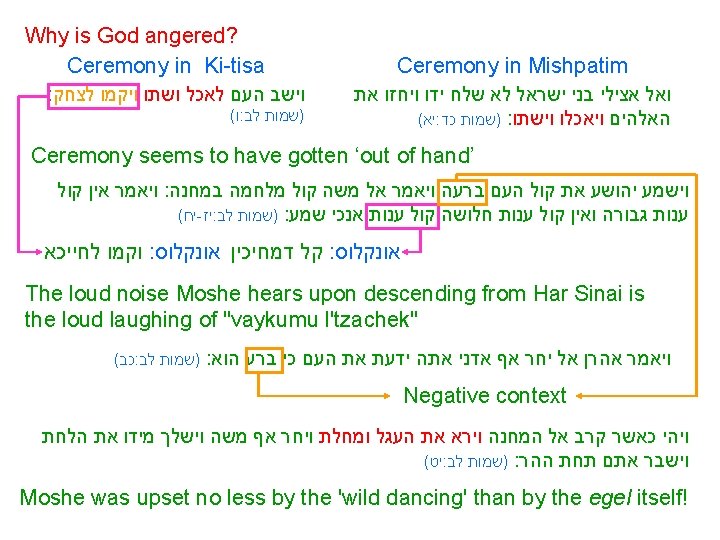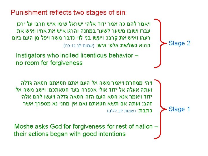 Two stages in sin at chet ha’egel: 1) Making a physical representation of God – improper but understandable 2) Frivolous behavior after the eating and drinking at the conclusion of the ceremony - inexcusable God’s double statement to Moshe after the sin סרו מהר מן הדרך : וידבר ידוד אל משה לך רד כי שחת עמך אשר העלית מארץ מצרים אשר צויתם עשו להם עגל מסכה וישתחוו לו ויזבחו לו ויאמרו אלהיך ישראל אשר : העלוך מארץ מצרים ועתה הניחה לי : ויאמר ידוד אל משה ראיתי את העם הזה והנה עם קשה ערף הוא ( י - ז : )שמות לב : ויחר אפי בהם ואכלם ואעשה אותך לגוי גדול Regression to Egyptian culture ‘Stiff-necked people' unable to change their ways God decides to destroy Bnei Yisrael, choosing Moshe to become His special nation instead