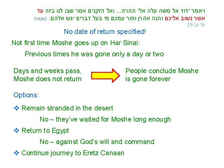 ואל הזקנים אמר שבו לנו בזה עד. . . ויאמר ידוד אל משה עלה אלי ההרה )שמות : אשר נשוב אליכם והנה אהרן וחור עמכם מי בעל דברים יגש אלהם ( יד - יב : כד No date of return specified! Not first time Moshe goes up on Har Sinai: Previous times he was gone only a day or two Days and weeks pass, Moshe does not return People conclude Moshe is gone forever Options: v Remain stranded in the desert No – they’ve waited for Moshe long enough v Return to Egypt No – against God’s will and command v Continue journey to Eretz Canaan